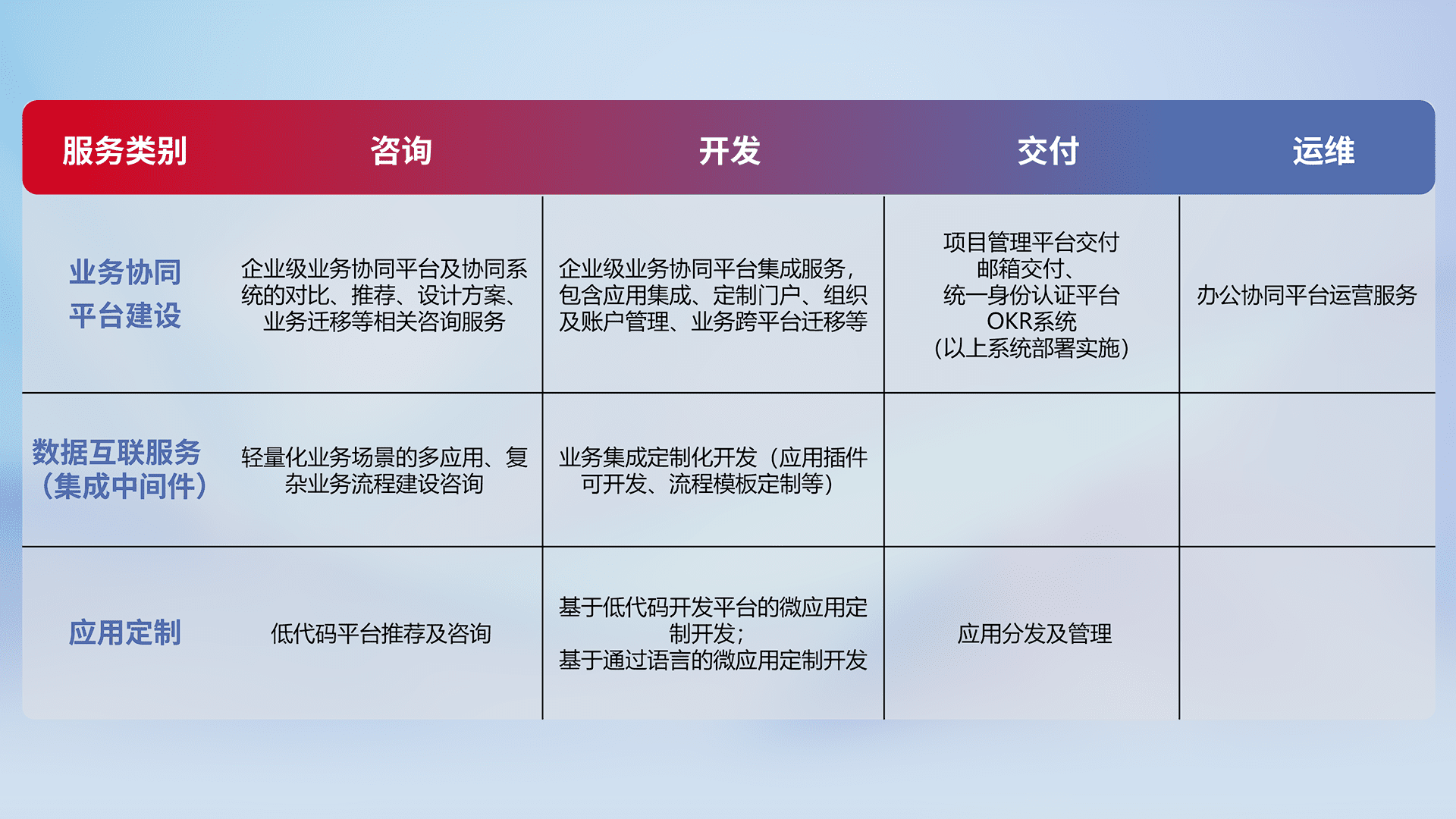 针对钉钉、、、企微、、IDaas等平台级产品提供产品的规划、、、方案、、、、交付、、、定制化开发等服务,,,实现如统一协同办公、、智能客户服务、、、混合会议管理、、、智能数据查询、、等业务场景,,,实现数字化转型。。。。